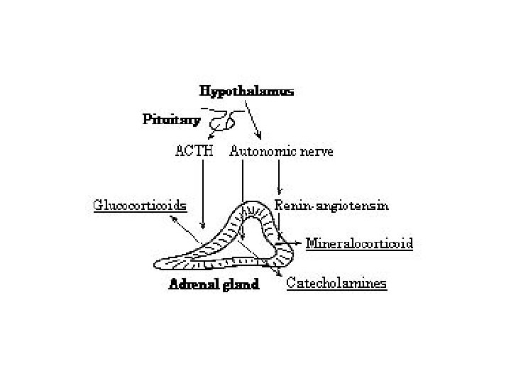 • Stress sympathoadrenergic, adrenocortical systems activated simultaneously – Catecholamines instantaneous action • From adrenal medulla and symp neurons • Rapid elimin’n w/ end release – Cortisol delayed 20 -30 mins, action prolonged • Involved in body weight regulation – Leptin secr’d by adipocytes • Acts on hypothal decr’d appetite, incr’d energy expenditure – Adipocytes have b 3 receptors • More responsive to norepi – Stim’n receptors enhanced lipolysis red’n fat stores decr’d leptin • BUT apparently not mediated through adrenal medulla
