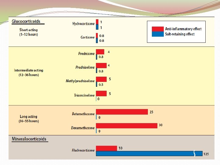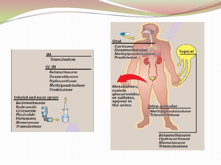 � 4. Have anti-inflammatory action: The most important therapeutic properties of the glucocorticoids are their potent anti-inflammatory and immunosuppressive activities. These therapeutic effects of glucocorticoids are the result of a number of actions: Ø The lowering of circulating lymphocytes is known to play a role. Ø Glucocorticoids inhibit the ability of leukocytes and macrophages to respond to mitogens and antigens. Ø Glucocorticoids also decrease the production and release of proinflammatory cytokines. Ø They inhibit phospholipase A 2, which blocks the release of arachidonic acid (the precursor of the prostaglandins and leukotrienes) from membrane-bound phospholipid. The decreased production of prostaglandins and leukotrienes is believed to be central to the antiinflammatory action. Ø Lastly, these agents influence the inflammatory response by stabilizing mast cell and basophil membranes, resulting in decreased histamine release. � 5. Affect other systems: High levels of glucocorticoids serve as feedback inhibitors of ACTH production and affect the endocrine system by suppressing further synthesis of glucocorticoids and thyroidstimulating hormone. In addition, adequate cortisol levels are essential for normal glomerular filtration. The effects of corticosteroids on other