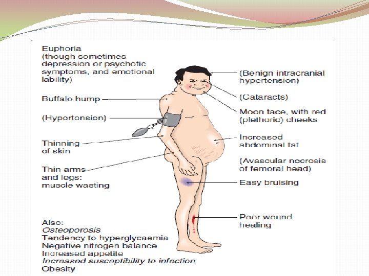 �Central nervous system effects: euphoria, depression and psychosis. �Other effects: glaucoma (in genetically predisposed persons), raised intracranial pressure and an increased incidence of cataracts. Topical therapy can also cause skin atrophy, ecchymosis, and purple striae. �Sudden withdrawal of the drugs after prolonged therapy may result in acute adrenal insufficiency because of suppression of the patient’s capacity to synthesize corticosteroids. Careful procedures for phased withdrawal should be followed. Recovery of full adrenal function usually takes about 8 weeks, although it can take 18 months or more after