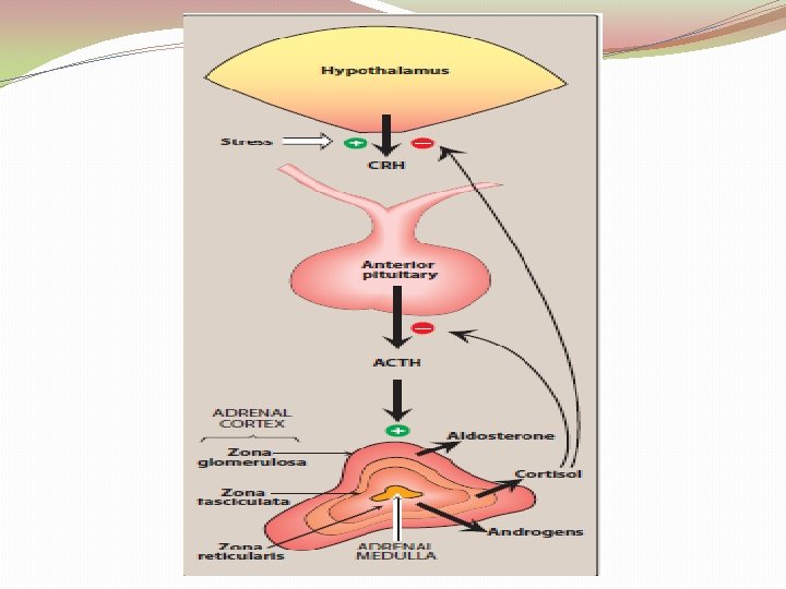 � The adrenal gland consists of the cortex and the medulla. The medulla secretes catecholamines, whereas the cortex secretes two types of corticosteroids (glucocorticoids and mineralocorticoids) and the adrenal androgens. � The adrenal cortex has three zones, and each zone synthesizes a different type of steroid hormone from cholesterol. The outer zona glomerulosa produces mineralocorticoids (for example, aldosterone) that are responsible for regulating salt and water metabolism. Production of aldosterone is regulated primarily by the renin–angiotensin system. The middle zona fasciculata synthesizes glucocorticoids (for example, cortisol) that are involved with metabolism and response to stress. The inner zona reticularis secretes adrenal androgens � Secretion by the two inner zones and, to a lesser extent, the outer zone is controlled by pituitary adrenocorticotropic hormone (ACTH; also called corticotropin), which is released in response to hypothalamic corticotropin -releasing hormone (CRH). Glucocorticoids serve as feedback inhibitors of ACTH and CRH secretion. � Both natural and synthetic corticosteroids are used for the diagnosis and treatment of disorders of adrenal function. They are also used—more often and in much larger doses—for treatment of a variety of inflammatory and immunologic disorders.