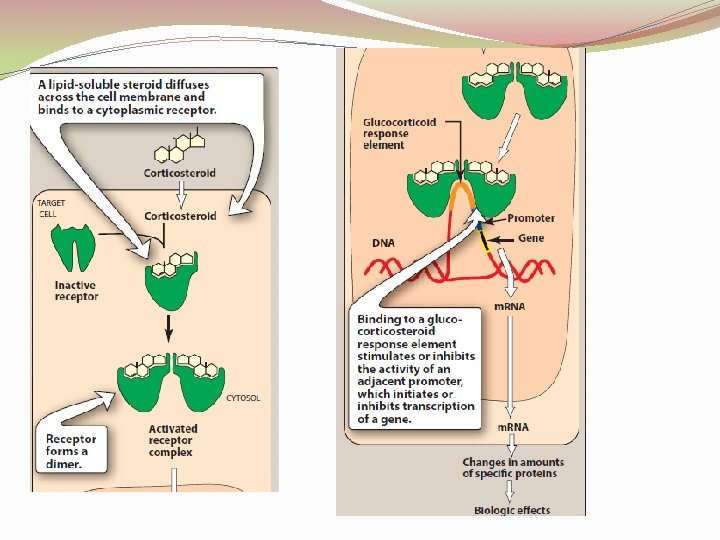 �corticosteroids �The corticosteroids bind to specific intracellular cytoplasmic receptors in target tissues. Glucocorticoid receptors are widely distributed throughout the body, whereas mineralocorticoid receptors are confined mainly to excretory organs, such as the kidney, colon, salivary glands and sweat glands. Both types of receptors are found in the brain. �After dimerizing, forming of a dimer , the receptor–hormone complex recruits coactivator (or corepressor) proteins and translocates into the nucleus, where it attaches to gene promoter elements. There it acts as a transcription factor to turn genes on (when complexed with coactivators) or off (when complexed with corepressors), depending on the tissue through binding to a glucocorticoid response element (GRE) on the regulatory region of the gene, and regulate transcription by RNA polymerase II and associated transcription factors. The resulting m. RNA is edited and exported to the cytoplasm for the production of protein that brings about the final hormone response. �This mechanism requires time to produce an effect. However,