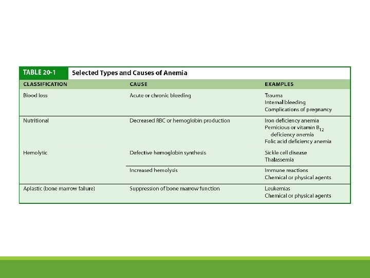 Anemia Hemoglobin concentration or number of circulating RBCs decreased Caused by ◦ Impaired RBC formation ◦ Excessive loss or destruction of RBCs