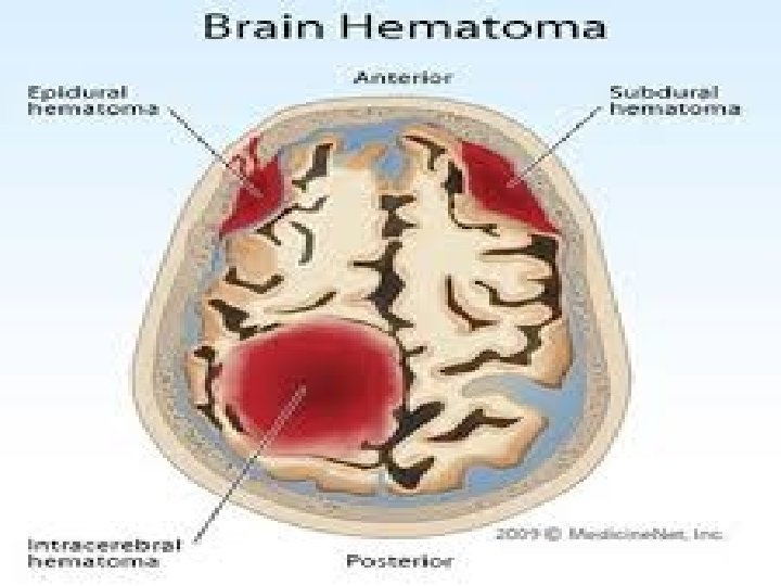 Types of Brain Injury : Intracranial Hemorrhage Hematomas are collections of blood in the brain that may be epidural (above the dura), subdural (below the dura), or intracerebral (within the brain). Major symptoms are frequently delayed until the hematoma is large enough to cause distortion of the brain and increased ICP.
