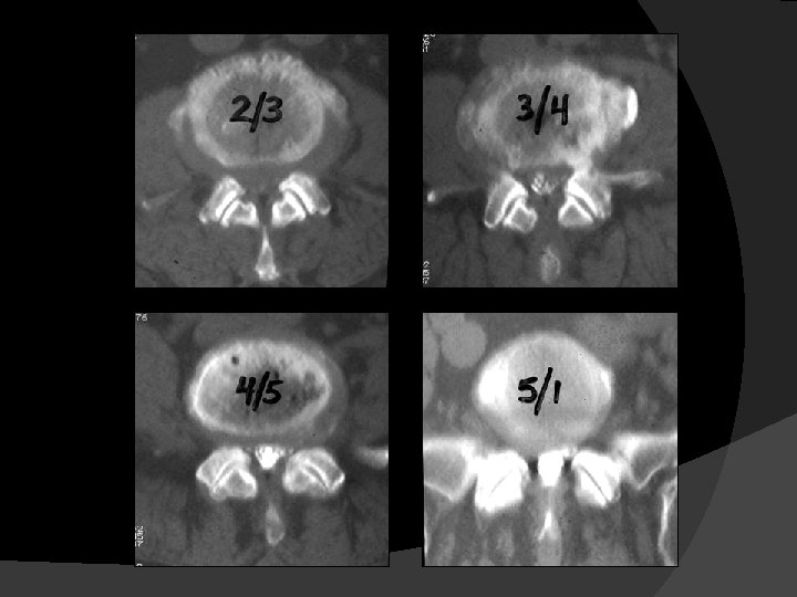 Characteristics �Central and lateral recess stenosis �“Stable” spines radiographically �Minimal/absent rotatory subluxations �Osteophytes present