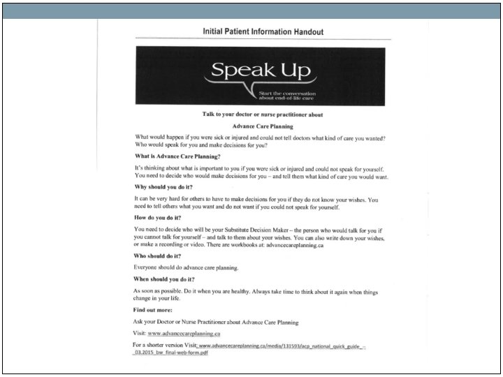 Script for Nurse or Administrative Assistant • “This is a new initiative recommended for everyone over the age of 65 regardless of health about making healthcare decisions. It is an important matter, we recommend that you read this pamphlet and let us know your decision to keep your file updated. Please speak to your physician/NP if you have any questions or concerns. ”
