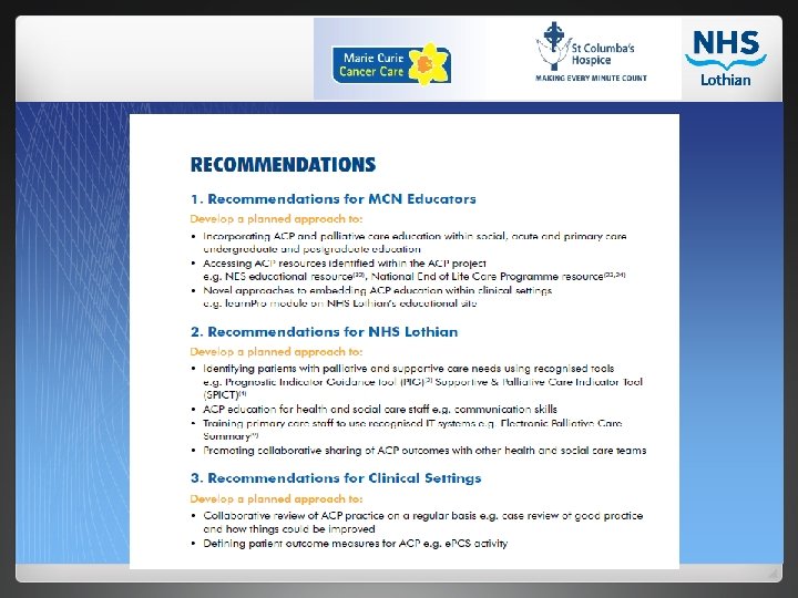 Strategic & Operational support: l Maintain a focus on supporting use of the e. PCS, and the DNAcp. R policy l Continue to develop the use of identification tools such as the SPICT l Develop a more coherent and standardised approach to ACP in Lothian