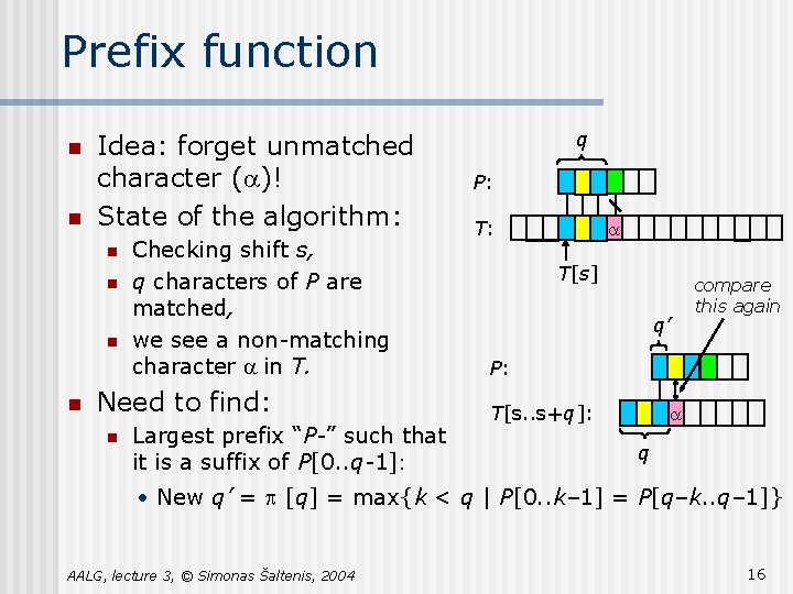 Prefix function n n Idea: forget unmatched character (a)! State of the algorithm: n n Checking shift s, q characters of P are matched, we see a non-matching character a in T. Need to find: n Largest prefix “P-” such that it is a suffix of P[0. . q-1]: q P: T: a T[s] q’ compare this again P: T[s. . s+q]: a q • New q’ = p [q] = max{k < q | P[0. . k– 1] = P[q–k. . q– 1]} AALG, lecture 3, © Simonas Šaltenis, 2004 16