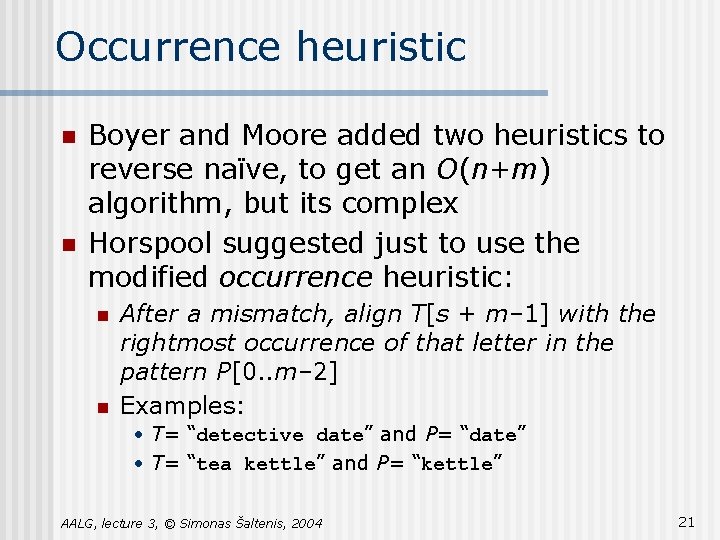 Occurrence heuristic n n Boyer and Moore added two heuristics to reverse naïve, to get an O(n+m) algorithm, but its complex Horspool suggested just to use the modified occurrence heuristic: n n After a mismatch, align T[s + m– 1] with the rightmost occurrence of that letter in the pattern P[0. . m– 2] Examples: • T= “detective date” and P= “date” • T= “tea kettle” and P= “kettle” AALG, lecture 3, © Simonas Šaltenis, 2004 21