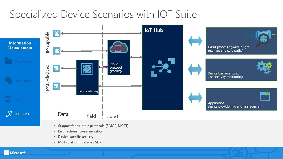 Specialized Device Scenarios with IOT Suite IP-capable Information Management Io. T Hub 1 1 0 0 1 1 1 0 1010 0111 Event processing and insight (e. g. hot and cold paths) PAN-devices Cloud protocol gateway Device business logic, Connectivity monitoring Field gateway Event Hubs IOT Hubs 0 0 Data Factory Data Catalog 10 Application device provisioning and management Data field cloud • Support for multiple protocols (AMQP, MQTT) • Bi-directional communication • Device specific secuirty • Multi-platform gateway SDK. 100110