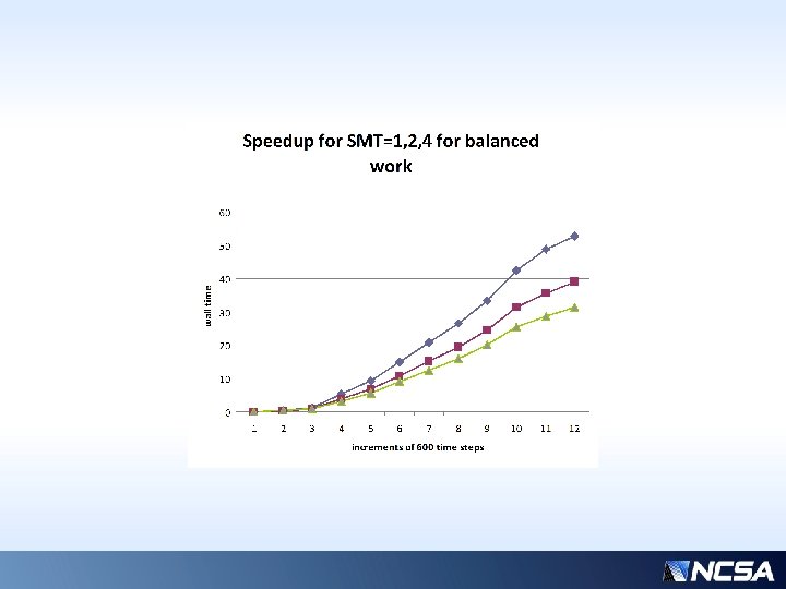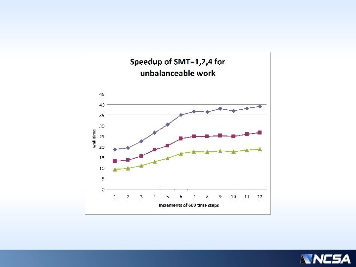 Positive Side-effect of SMT on Messaging • Notice that communication-wait performance also responds dramatically to SMT concurrency, even though the messaging itself is not contained in a parallel region. • Shows sensitivity of communication wait latencies on “flops” workload per processor