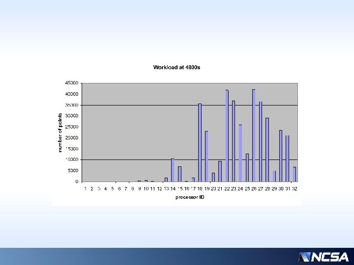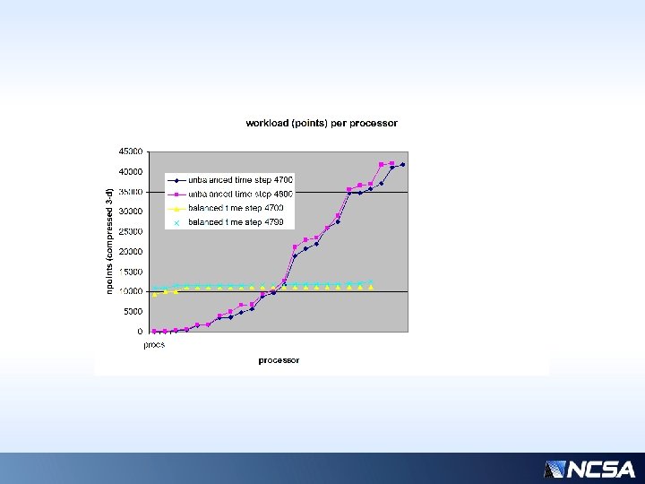 Algorithm • Every ~100 time steps, globally share “count” of each processor’s work (i. e. compressed work points) • Found that isends/irecvs somewhat better than collective allgather for this • Find max/min/ave counts and locations among the global data • Iterate, for each max-min pair, send minimum amount necessary required to bring one to the average value.