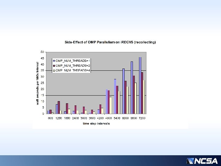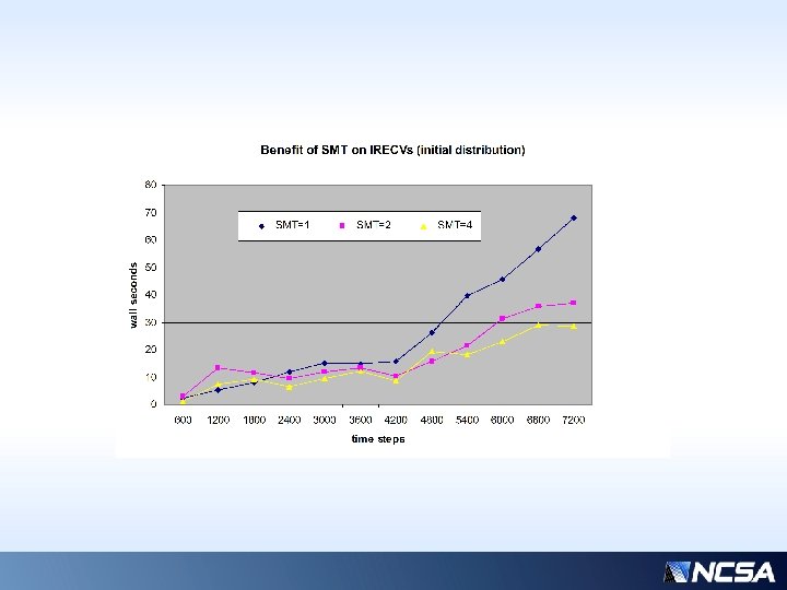 Benchmark machine: IBM P 780, 32 cores (1 node), SMT=4, 3. 864 GHz, use of placement hybrid launch tool • Had originally developed work on IBM Power 5+ (1000+ cores) • Initial timing profile indicated show-stopping latency at initial data exchange for >256 cores • Moved focus to smaller machine, single node, P 7, for more precise analysis • From new timing profiles, next zoomed in on just the two most extreme processors (max, min times)