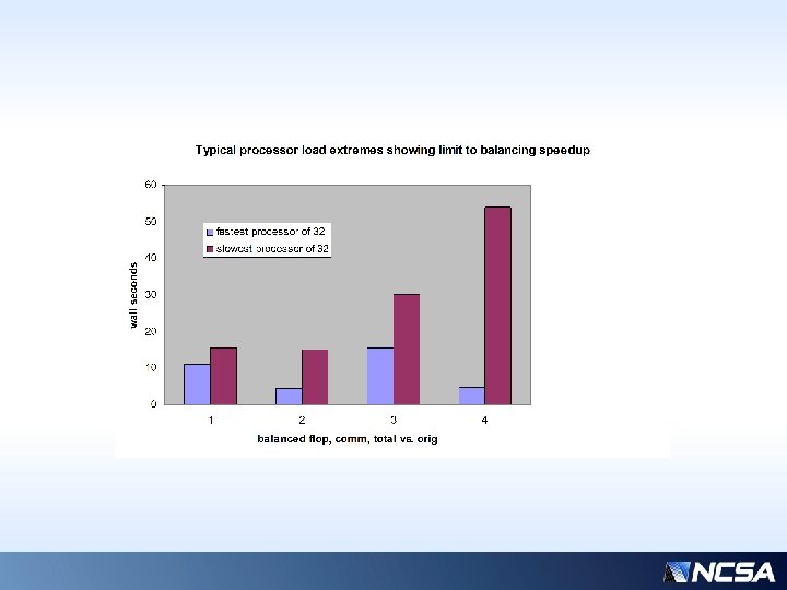 Previous slide… • Over a typical time interval (4200 -4800 s), the component times of the slowest/fastest processors are shown. • “common” times (those that are not balanceable, constant, or insignificant) have been removed for clarity • Assuming performance is limited by the slowest processor, even with nearly ideal balancing, we could only hope for ~3 x speedup… (~50 / ~15 ) * • But there is comm overhead (column 2)… • Actual realizable speedup is more like 5/3 • * Why only 3 x? For only 32 processors, this is highly sensitive to the average workload distribution…