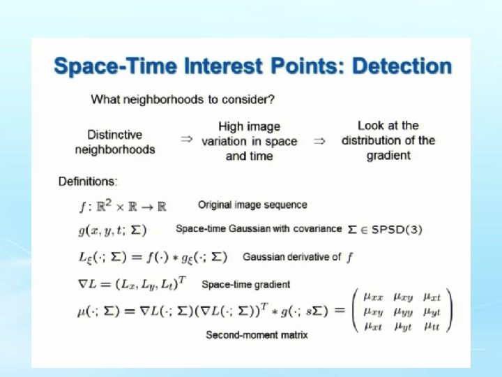 Representation of Features • construct its scale-space representation using Gaussian convolution kernel g • compute the second-moment matrix using spatiotemporal image gradients • define positions of features by local maxima