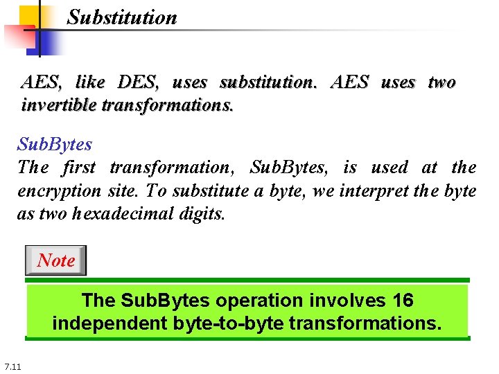 Substitution AES, like DES, uses substitution. AES uses two invertible transformations. Sub. Bytes The first transformation, Sub. Bytes, is used at the encryption site. To substitute a byte, we interpret the byte as two hexadecimal digits. Note The Sub. Bytes operation involves 16 independent byte-to-byte transformations. 7. 11