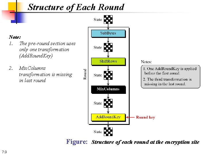 Structure of Each Round Note: 1. The pre-round section uses only one transformation (Add. Round. Key) 2. Mix. Columns transformation is missing in last round Figure: Structure of each round at the encryption site 7. 9