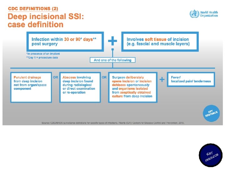 The WHO approach to SSI surveillance in settings with limited resources • WHO has created an adapted approach that has been used in settings with limited resources to conduct surveillance in the context of interventions to reduce SSI. • The protocol is based on the widely accepted Centers for Disease Control and Prevention – National Healthcare Safety Network (CDCNHSN) definitions for SSI, but definitions based on clinical signs and symptoms should be prioritized, given the lack of high-quality microbiology laboratory support. • For feasibility reasons, this protocol is based on post-discharge surveillance up to 30 days only. • Patient follow-up after discharge includes phone calls and involvement of the patient in recognizing signs and symptoms of SSI.
