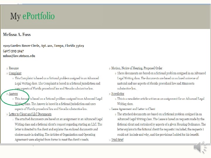2. Complete three follow-up assignments: – Drafting a Complaint – Conducting a witness interview. – Drafting an email to a potential client. 3. Complete a real-world assessment of legal communication practices. 4. Complete Practice-Ready e. Portfolio. – Examples of legal communication work 5. Satisfactorily complete Core Grammar for Lawyers.