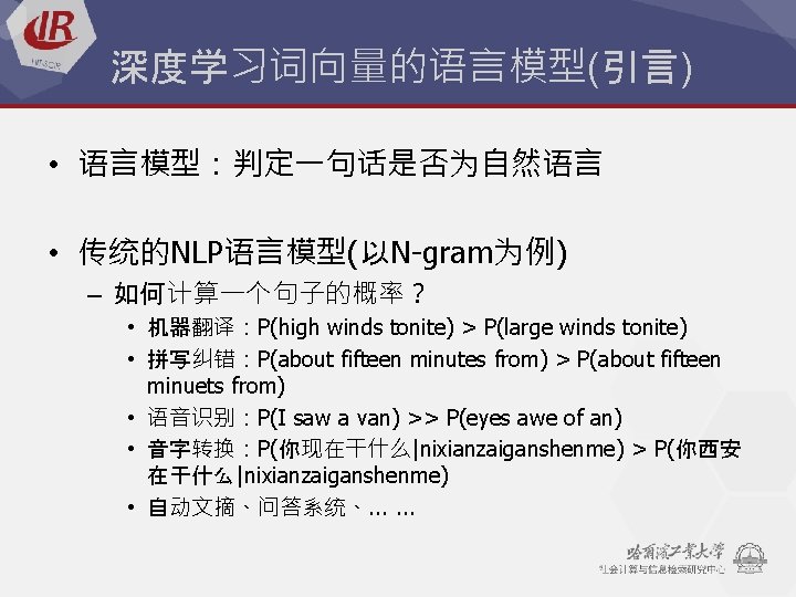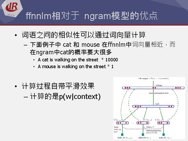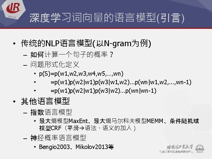 深度学习语言模型都有哪些?(粗略) • 2008,Ronan Collobert 和 Jason Weston – C&W model – 《Natural Language Processing (Almost) from Scratch》 • 2008,Andriy Mnih 和 Geoffrey Hinton – 《A scalable hierarchical distributed language model》 • 2010,Mikolov – RNNLM – 《Recurrent neural network based language model》 • 2012,Huang – 《Improving Word Representations via Global Context and Multiple Word Prototypes》