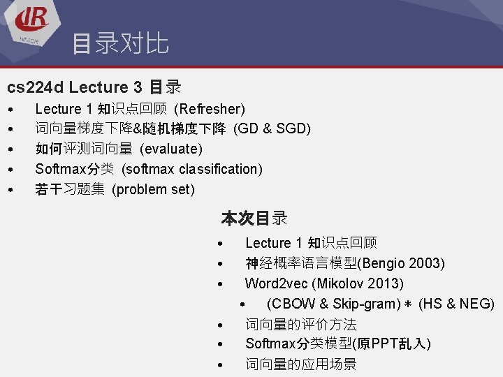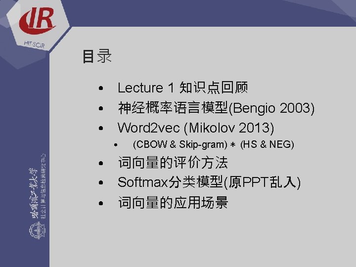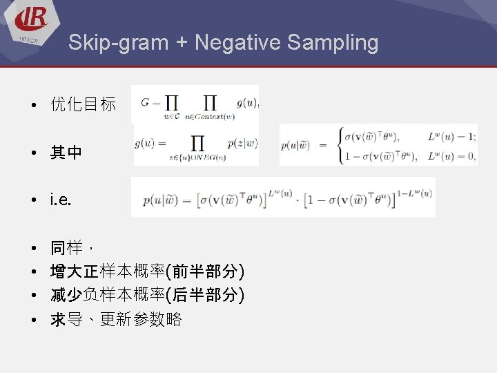 (CBOW & Skip-gram) *2 • 两个模型(可选其一) – CBOW (Continuous Bag-Of-Words Model) – Skip-gram (Continuous Skip-gram Model) • 两套框架(可选其一) – Hierarchical Softmax – Negative Sampling