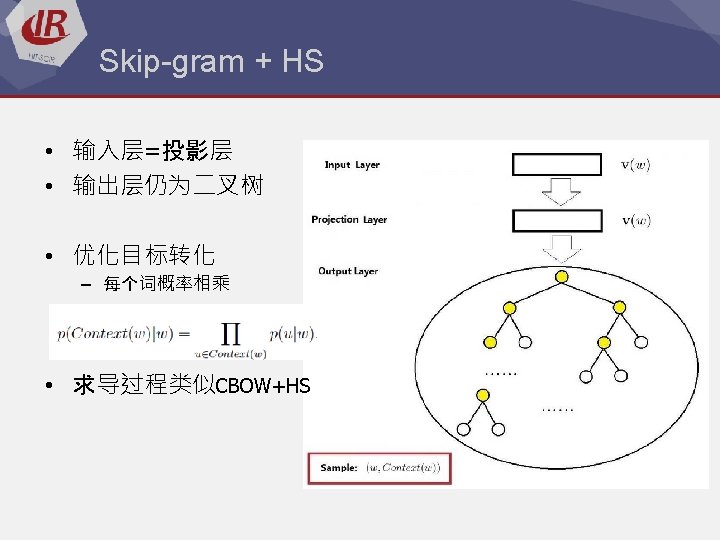 CBOW+HS (hierarchical) • No hierarchical structure – 输出层每一个词都算一遍,时间复杂度是O(|V|) • Binary tree – O(log 2(|V|))
