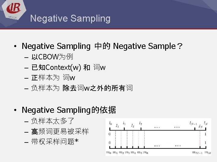 Negative Sampling • Negative Sampling (简称NEG) – – 理论支撑Noise Contrastive Estimation(NCE) 用于提高训练速度、改善词向量质量 Hierarchical softmax的替代版本 采用随机负采样替代tree structure