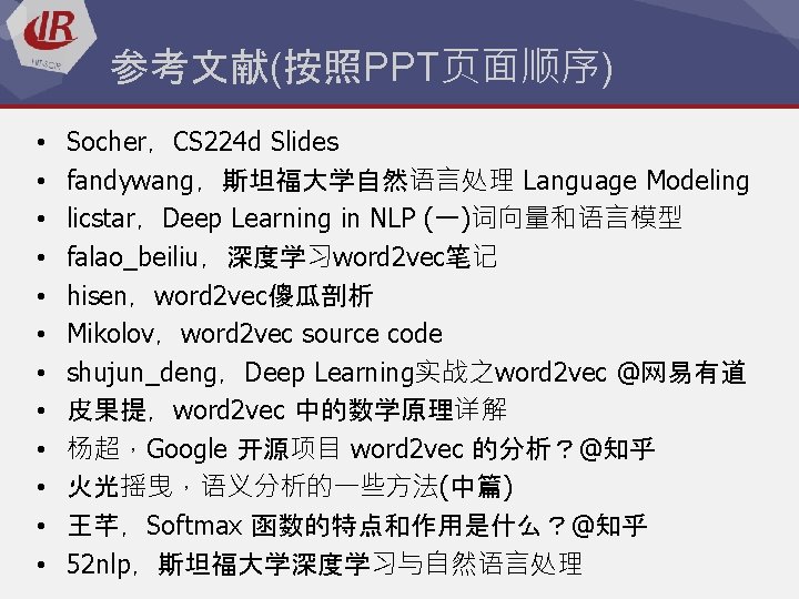 最后:词向量的应用汇总 • NLP任务 – 挖掘词之间的关系,word analogy,譬如同义词、上位词 – 将词向量作为特征应用到其他机器学习任务中,例如作为文本分 类的feature,NER、CHK等任务 – 机器翻译 – Relational extraction – Connecting images and sentences,image understanding • 非NLP任务 – 将qq群作为doc,用户作为word,训练user distributed representation,挖掘相似user – 将query session作为doc,query作为word,训练query distributed representation,挖掘相似query – 将不同用户点击行为作为doc,单个点击作为word,训练product distributed representation,挖掘相似product