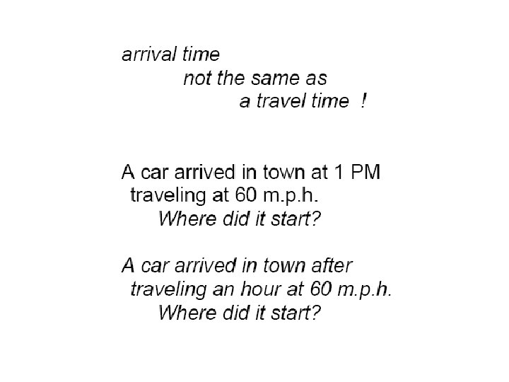 Arrival Time ≠Travel Time Q: a car arrived in town after traveling for an half an hour at sixty miles an hour. Where did it start? A. Thirty miles away Q: a car arrived in town at half past one, traveling at sixty miles an hour. Where did it start? A. Are you crazy?