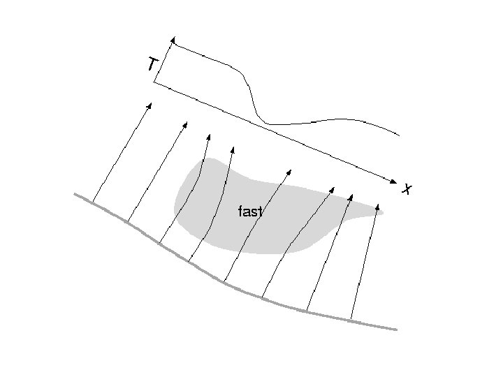 In a vertically-stratified earth, rays are bent back up to the surface, so both Points A and B are on the surface. y ra t ron vef wa The pattern of differnetial traveltime is more complicated …
