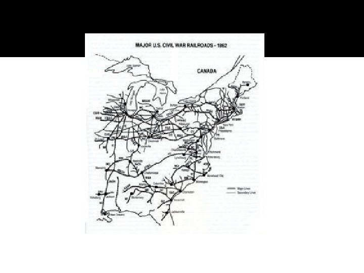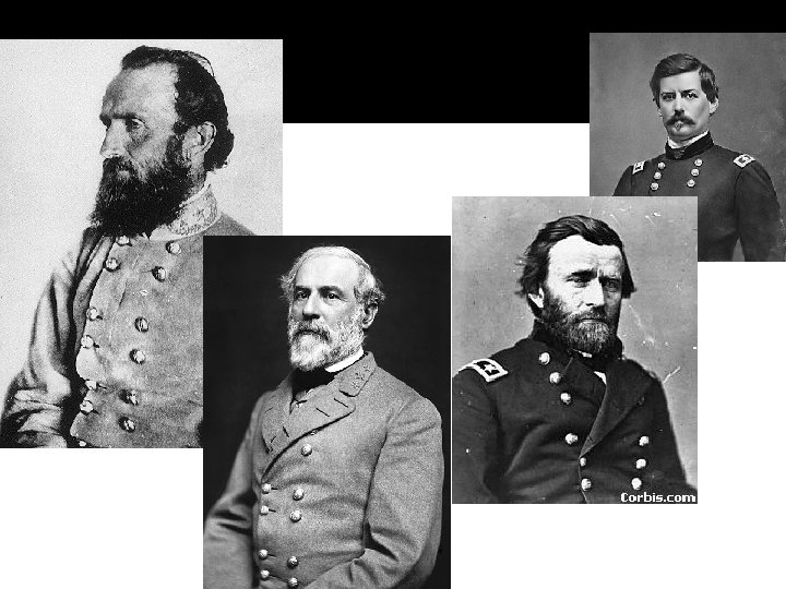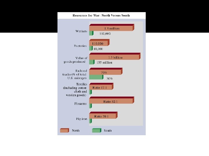 Advantages North and South NORTH SOUTH � Industrialized � Trains � People (draft) � Strong economy � Navy � Will � Better generals � Military background � Defensive position � “Old ironsides”