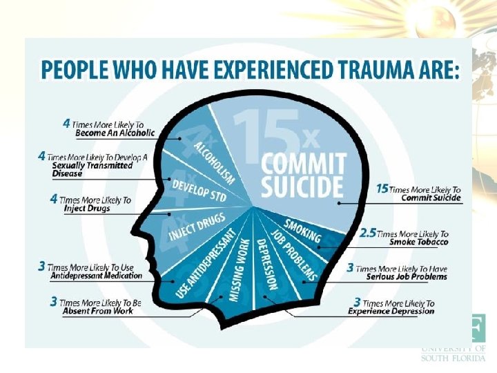 People who have experienced trauma are: • • • 15 times more likely to attempt suicide 4 times more likely to become an alcoholic 4 times more likely to develop a sexually transmitted disease 4 times more likely to inject drugs 3 times more likely to use antidepressant medication 3 times more likely to be absent from work 3 times more likely to experience depression 3 times more likely to have serious job problems 2. 5 times more likely to smoke 2 times more likely to develop chronic obstructive pulmonary disease National Center for Mental Health Promotion and Youth Violence Prevention, "Childhood Trauma and Its Effect on Healthy Development, " (http: //sshs. promoteprevent. org/sites/default/files/trauma_brief_in_final. pdf)