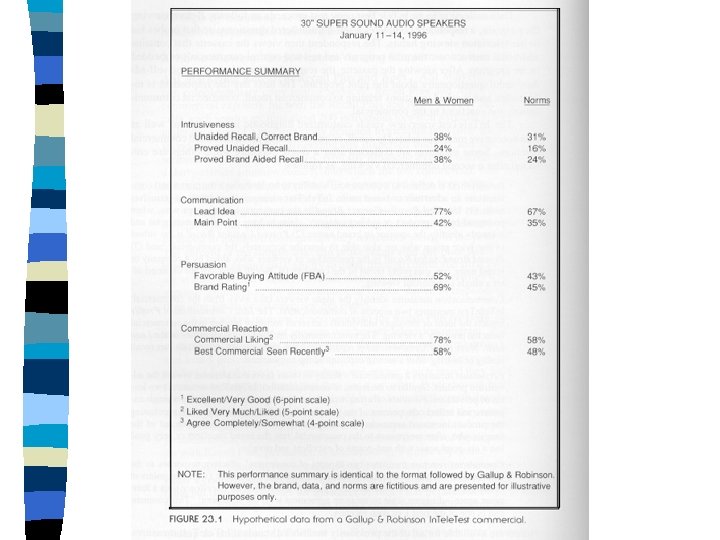 How The Ad. Test Results Are Analysed n n The key measures: main idea communication, likeability, potential elements of confusion, brand purchase motivation and ability to communicate key sales points. Scores are compared to a normative database of several hundred tests. Specific product categories are reviewed as well as best and worst case scenarios.