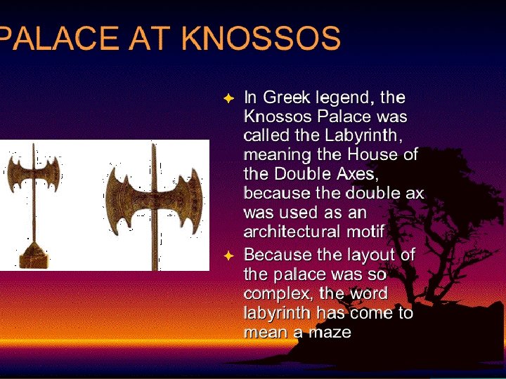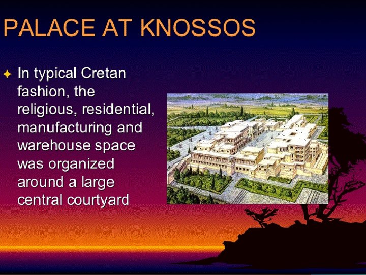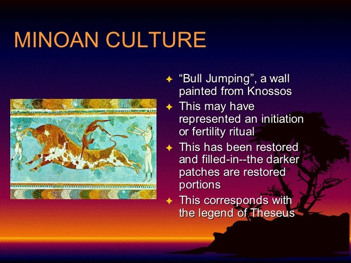 Minoan Artwork found on the island of CRETE – called Minoan because of the legend of King Minos Very rich civilization with many references to bulls and ocean themes PALACE OF KNOSSOS – Huge palace about 6 acres in size! 1 st excavated by Sir Arthur Evans in 1900 Amphora – two handled vase used to carry wine, oil, olives, etc. Amphi ("on both sides") + phoreus ("carrier")
