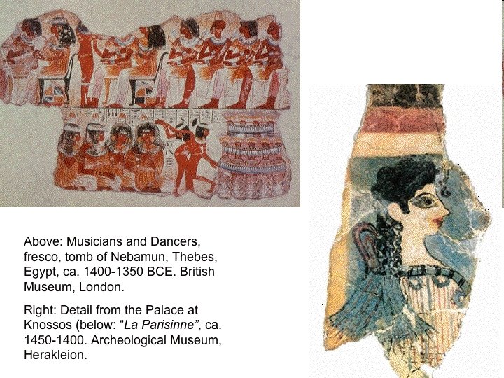 Minoan Fresco Like their Egyptian contemporaries living 500 miles southeast of them, the Minoans illustrated figures with legs standing in profile and eyes, in profiled faces, staring at the viewer. So, the Minoans were not entirely revolutionary painters. Minoan artists did, however, figure out how to show torsos in profile. They drew bodies as working wholes, not as figures awkwardly twisted in the middle. More importantly, the outlines of their figures are rounded and lively. By comparison, the figures in Egyptian scenes appear stiff and uncomfortable. “The Fisherboy” was excavated from a house preserved beautifully by volcanic ash.