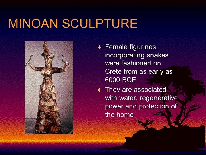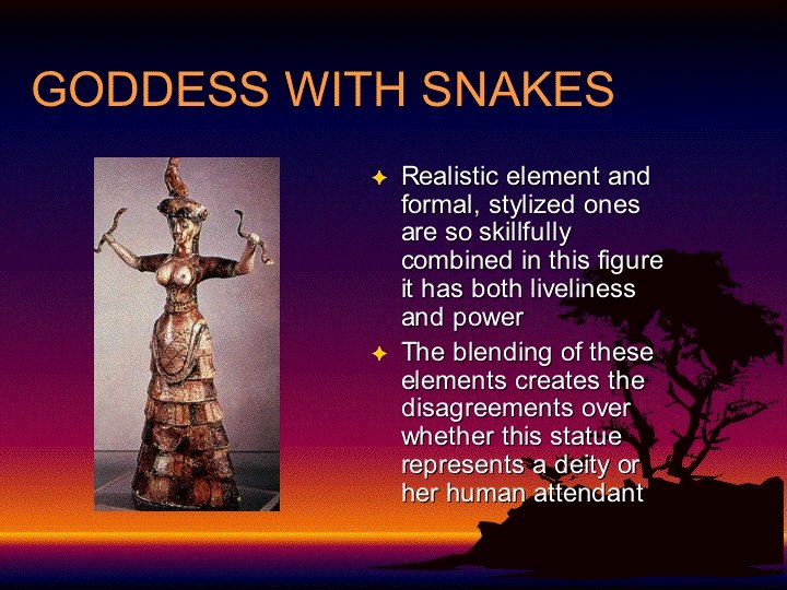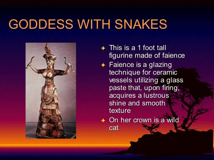 Religion • Most Minoan life revealed through its religious practices and art. • 1. Matriarchal society • 2. Center of worship was a mother goddess • 3. Earth goddesses portrayed in various forms.