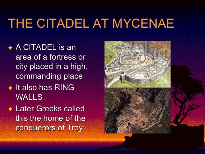 Mycenaeans = “Rich In Gold” Thanks to tombs, graves excavated in Mycenae find many kings and their families buried with gold, much like the Egyptians…Woman with jewelry, Men with weapons and golden cups. Mask of Agamemnon: The mask was created by hammering gold into a thin leaf over a wooden form.