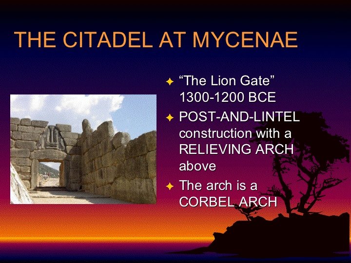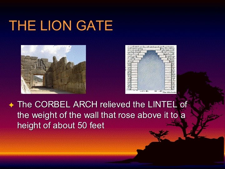 Lion Gate of Mycenae Guardian-like lions that guarded the entrance to the Citadel… Heads are now gone. Corbelled Arch Post & Lintel
