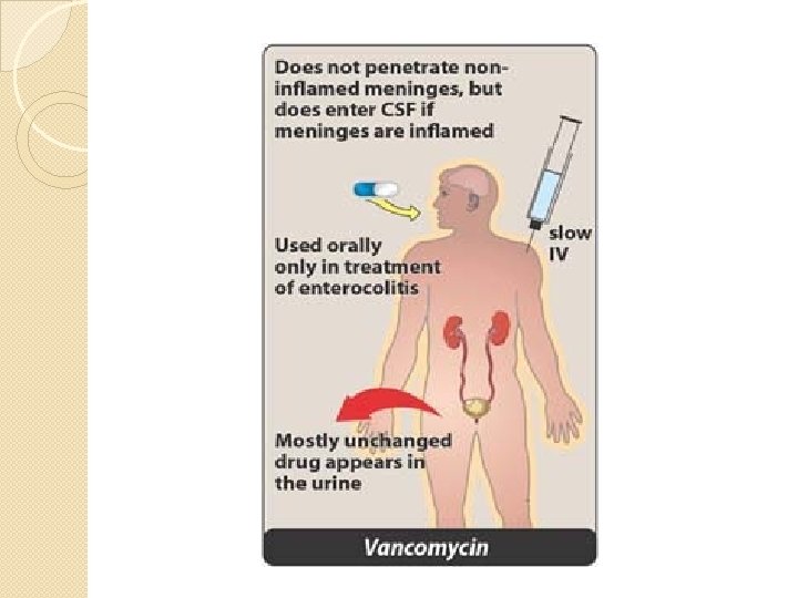 Cont’d �Side effect: Fever , rashes 2. Thrombophlebitis at the site of injection 3. Ototoxicity & nephrotoxicity especially when combined with aminoglycosides 4. Rapid infusion: �Flushing of upper body red man or red neck syndrome due to release of histamine �Hypotension �Pain & muscle spasm of chest & back 1.