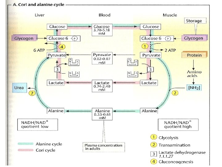 The glucose-alanine cycle • Muscles produce: produce 1 - Pyruvate from glycolysis during exercise 2 - NH 2 produced from normal protein degradation Pyruvate + NH 2 Alanine • Alanine is transported through the blood to liver • Liver converts alanine back to pyruvate Alanine – NH 2 = Pyruvate • • • Pyruvate is converted to glucose (gluconeogenesis). Glucose is transported to muscle to be used for energy again. Liver converts NH 2 to urea for excretion (urea cycle)