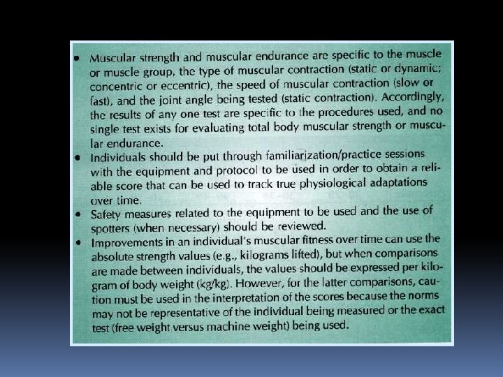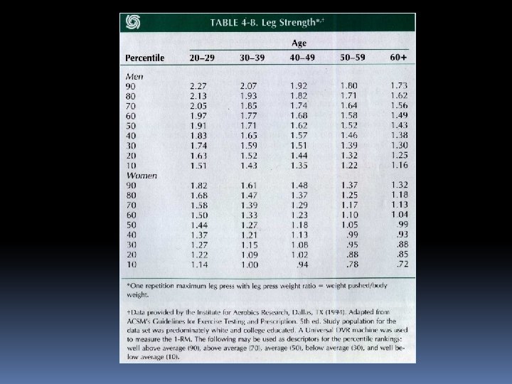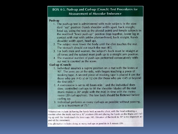 Field Tests 12 min run VO 2 = 3. 126 (meters in 12 min) - 11. 3 1. 5 mile run VO 2 = 3. 5 + 483/(time in minutes) Rockport Walking Test (1 mile walk) VO 2 = 132. 853 - 0. 1692 (BW in kg) - 0. 3877 (age in y) + 6. 315 (gender) - 3. 2649 (time in min) - 0. 1565 (HR) 0 for female; 1 for male; HR at end of walk