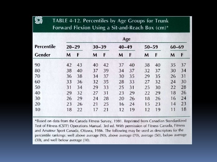 Sit and Reach Box If a standard sit-and-reach box is available, heels should be place against the edge of the box The participant slowly reaches forward with both hands as far as possible, holding this position momentarily Knees remain extended Participant should not hold their breath This norms are based on a sit-and-reach box in which the “zero” point is set at 26 cm. When using a box in which the “zero” point is set at 23 cm, subtract 3 cm from each value in the tables