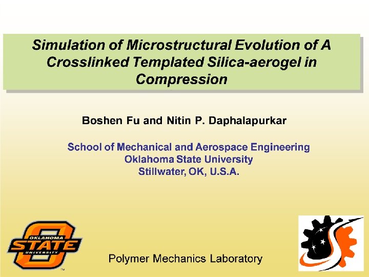 Crosslinked Silica Aerogel – MPM Simulation Flexural Modulus Estimation Weight ratio( Polymer: Silica)=70%: 30% Density of polymer = 1. 2 g/cc Density of silica = 2. 6 g/cc Modulus of polymer = 2 Gpa Modulus of silica =70 Gpa The volume ratio( Polymer: Silica) ≈5: 1 The dimensionless radius of the model R=6 Based on the bending equation for the composite material The silica-aerogel modulus is about 3. 889 Gpa