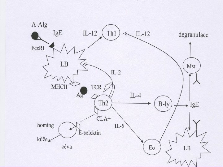 Senzibilizace u prezentace Ag naivním T lymfocytům v parakortikální zóně lymfatické uzliny (nutné kostimulační signály) pokud dojde k senzibilizaci diferenciace směrem k Th 2 typu - produkce cytokinů ( IL-4, 5, 13…) a aktivace B ly (produkce antigen spec. Ig. E a vazba na LB) - klonální expanze T ly ( exprese CLA) a následně homing v kůži u