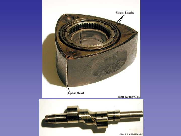 At the apex of each face is a metal blade that forms a seal to the outside of the combustion chamber. There also metal rings on each side of the rotor that seal to the sides of the combustion chamber. The rotor has a set of internal gear teeth cut into the center of one side. These teeth mate with a gear that is fixed to the housing. This gear mating determines the path and direction the rotor takes through the housing.