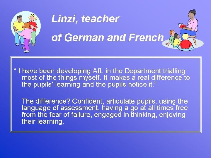 Teacher development • Not ‘old dogs learning new tricks’ but ‘old dogs re-affirming and redefining old tricks’ • A gradual, stepped, trialling approach to developing Af. L • Peer observation and video-ing sequences of ‘best bits’ • Collaborative planning e. g. of targets, primary –secondary liaison (literacy; KS 3 strategy; 14 -19 learning roles • From practice to policy: teachers / pupils /parents