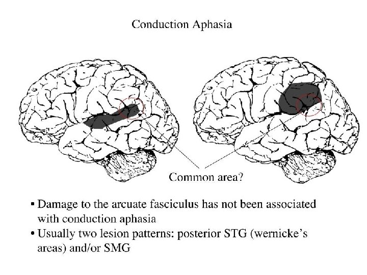 AFASIA DE CONDUCCION • Lenguaje fluido y parafasico • Comprensión de lenguaje relativamente buena • Severo compromiso de la repetición • Nominacion alterada por parafasias literales • Puede asociarse a paresia o hipoestesia • Lesion habitualmente compromete girus supramarginalis y substancia blanca subyacente (fasciculo arcuato)