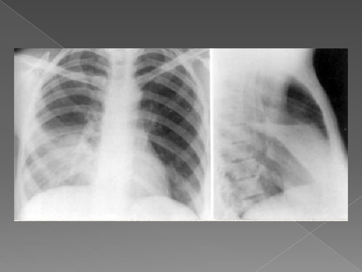 Examen radologic �in pneumonia lobara sau segmentara opacitatea subcostala bine delimitate, omogena in stadiile incipiente; �in bronhopneumonie unice sau multiple opacitati disseminate, de diferite marimi, forma, intensitate cu contur neclar, neomogene si variabile �in pneumonia interstitiala