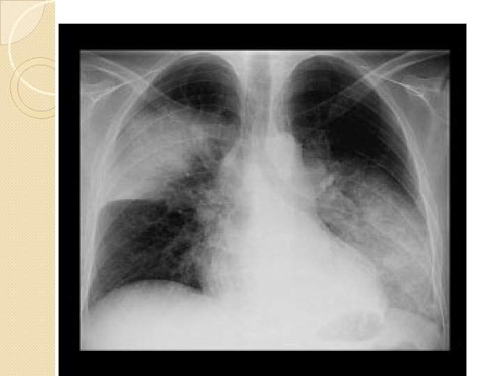 Radiologic: opacitati rotunde/ovalare, contur estompat, diseminate opacităţi multiple de intensitate medie, numeroase în câmpurile pulmonare medii şi bazale opacităţi difuze, mai frecvent in c. pulmonare superioare ca şi in regiunile parahilare
