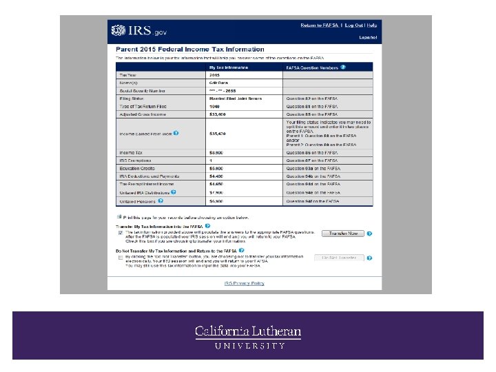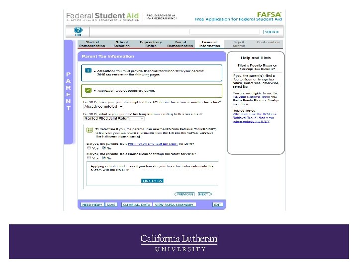 FAFSA Helpful Hints 2017 -18 • NEW - Use 2015 tax information for the 2017 -18 FAFSA – No need to wait for tax returns to be completed – No need to use estimated income information – The majority of families will be able to use the Data Retrieval Tool (found in the Financial Information tab) – Gives families longer time to evaluate financial aid awards – Allows families to make more informed decisions on college selection