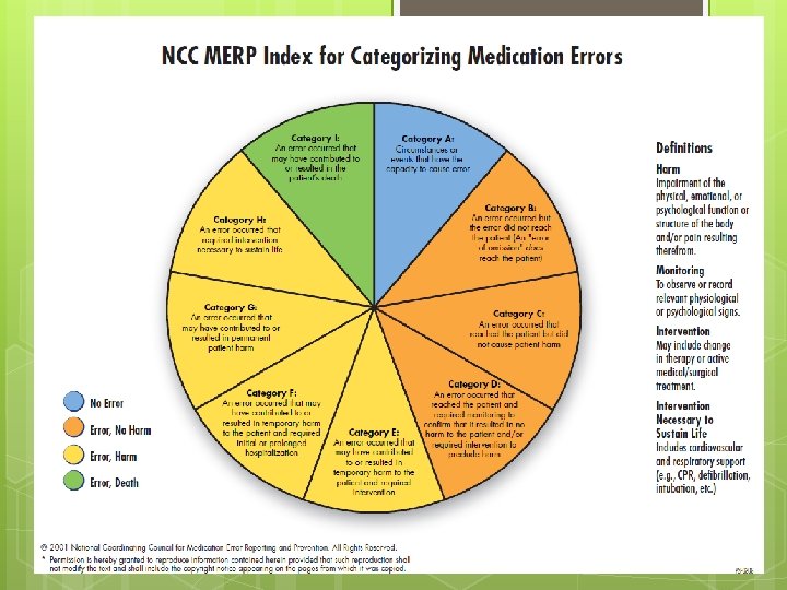 NCC MERP Index for categorising errors Error, Harm Category E – error may have resulted in temporary harm & required intervention Category F – error may resulted in temporary harm and initial or prolonged hospitalisation Category G – error resulted in permanent patient harm Category H – error required intervention to sustain life
